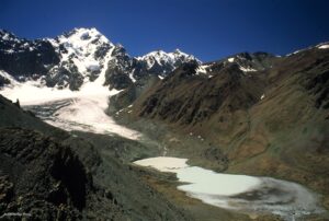 Raggiungiamo il lago poco prima di mezzogiorno. La valle qui è più ampia e luminosa. Oltre le acque biancastre, la parete completamente ghiacciata del Tonmori, “Possente alta montagna”, si eleva maestosa fino alla vetta che sfiora 6000 metri, la più elevata della valle.