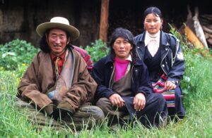 All’aperto, davanti a tavoli di legno, siede un folto gruppo di uomini, donne e bambini. Di corporatura robusta, indossano abiti caldi e scarpe pesanti. Tra gli uomini, alcuni portano i capelli lunghi. Donne e bambini hanno le gote arrossate, come se avessero passato del tempo al freddo. Parlano e scherzano, allegri e sereni. Sono tibetani, arrivati nel Solu Khumbu, nel Nepal orientale, dopo un lungo viaggio a piedi.