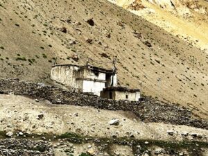 Sono passate due ore da quando abbiamo lasciato Kanji. Sul versante destro, poco al di sopra del torrente, incontriamo il Lachutse Gonpa, l’Eremo della Valle dei Rabarbari. La sua posizione è dominante rispetto a un gruppo di casupole, una vicina all’altra, edificate ai suoi piedi come abitazioni estive. È un luogo di pace e serenità, adatto a coloro che intendono dedicarsi alla pratica religiosa.